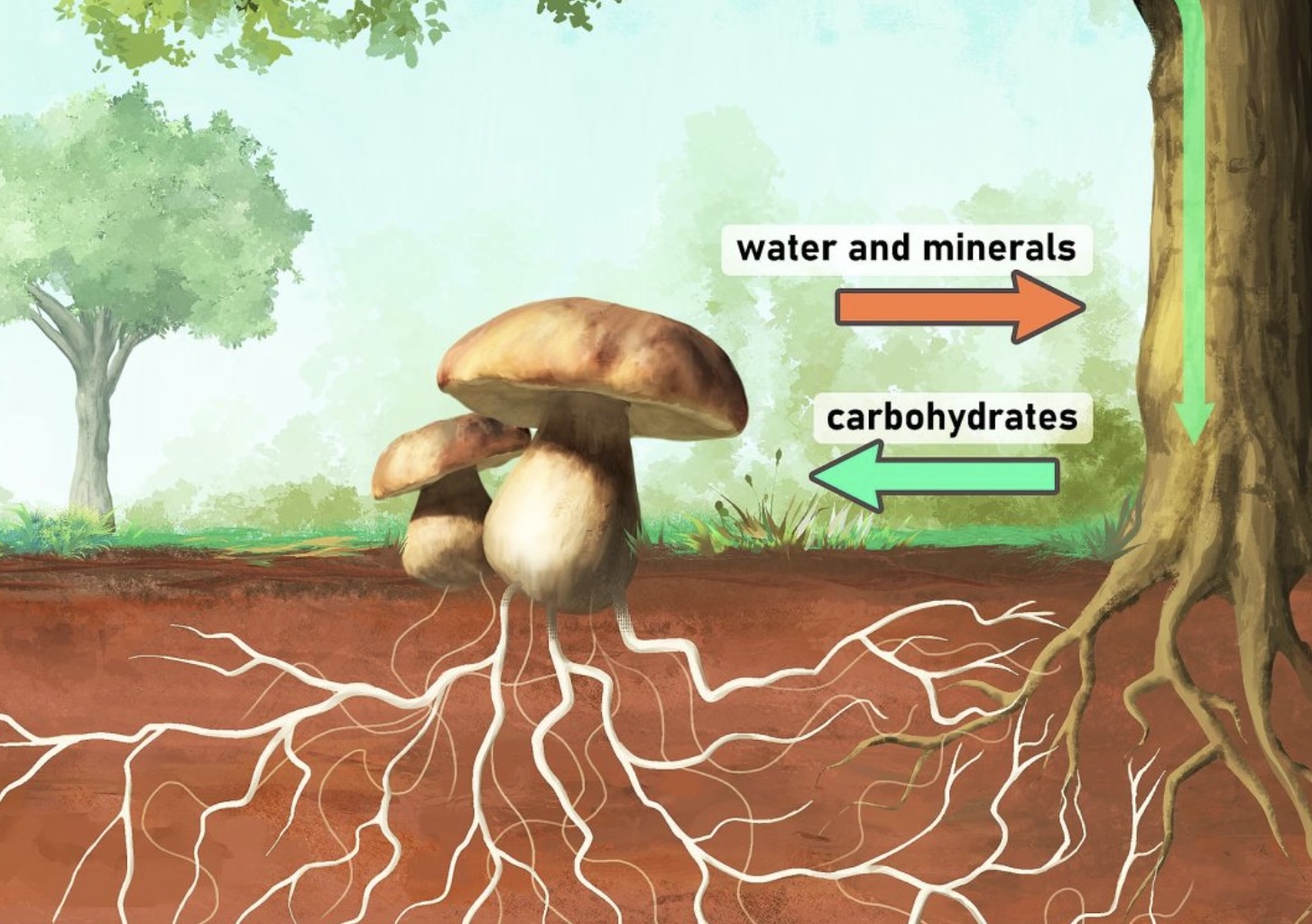 “Io ti dò i minerali che ti servono, tu mi dai gli zuccheri che invece servono me”. In sintesi, è questo il baratto stabilito fra funghi e piante circa 450 milioni di anni fa. I funghi del suolo erano già presenti sulla Terra da 800 milioni di anni ed erano abili, con i loro lunghi filamenti, le ife, a recuperare sostanze minerali. All’inizio, come spiega Bonfante in Piante, noi e loro , il suolo come lo conosciamo oggi non era ancora formato e le piante non avevano radici. La simbiosi con i funghi è stato un accordo “win-win” : offriva vantaggi a entrambe le parti. Cedere carboidrati semplici non è senza costi per la pianta. Per cui – come hanno dimostrato alcune ricerche – quando il fosfato (un minerale che serve alla pianta) abbonda nel terreno, il vegetale ha modo di arrangiarsi da solo, e il fungo resta in attesa di tempi migliori. Si coopera se necessario: la simbiosi non è uno scambio caritatevole.
